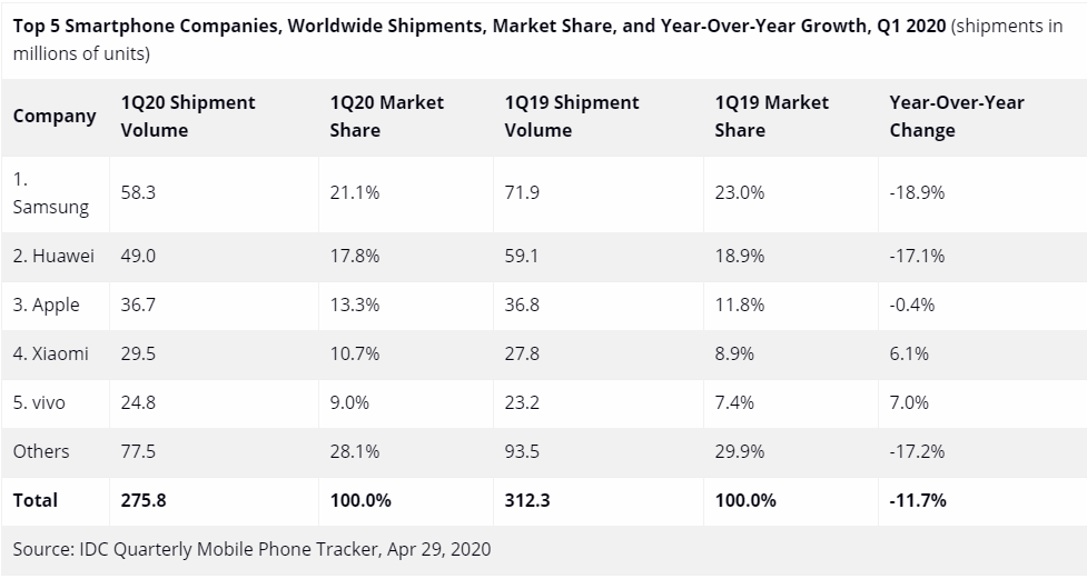 见圳客户端·深圳新闻网2020年5月6日讯 国际权威机构IDC最新报告显示,全球智能手机出货量在2020年第一季度同比下降11.7%。其中,三星、华为、苹果依旧稳居前三,分别为21.1%、17.8%和13.3%。