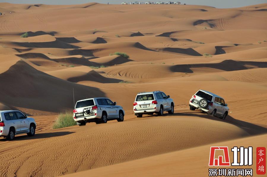 去迪拜,一个最不可错过的体验项目就是"冲沙"。所谓冲沙,就是高速的车在沙丘里不断爬坡、俯冲、腾飞、落下等等一系列惊险的动作。李仁奇摄