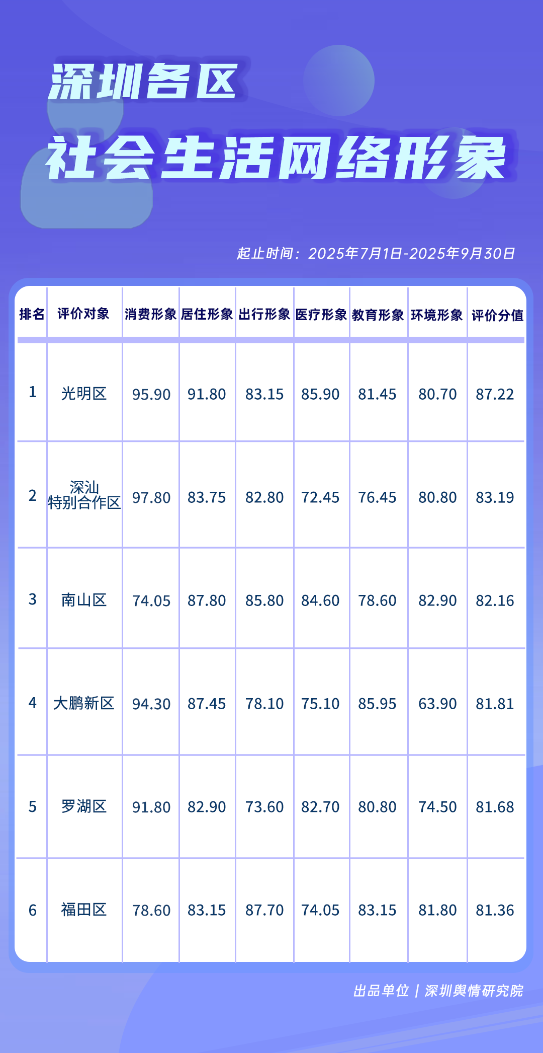 7-9月,《深圳各区社会生活网络形象榜》中,光明区凭借在消费、居住等方面的良好网络呈现,获得较高综合评价分值,深汕特别合作区、南山区也表现优异,得分在83分左右。大鹏新区、罗湖区、福田区也在榜单中占据靠前位置,体现了各区在社会生活方面的网络形象情况,也反映出各区在提升民生服务质量与促进区域协调发展方面取得的积极成效。