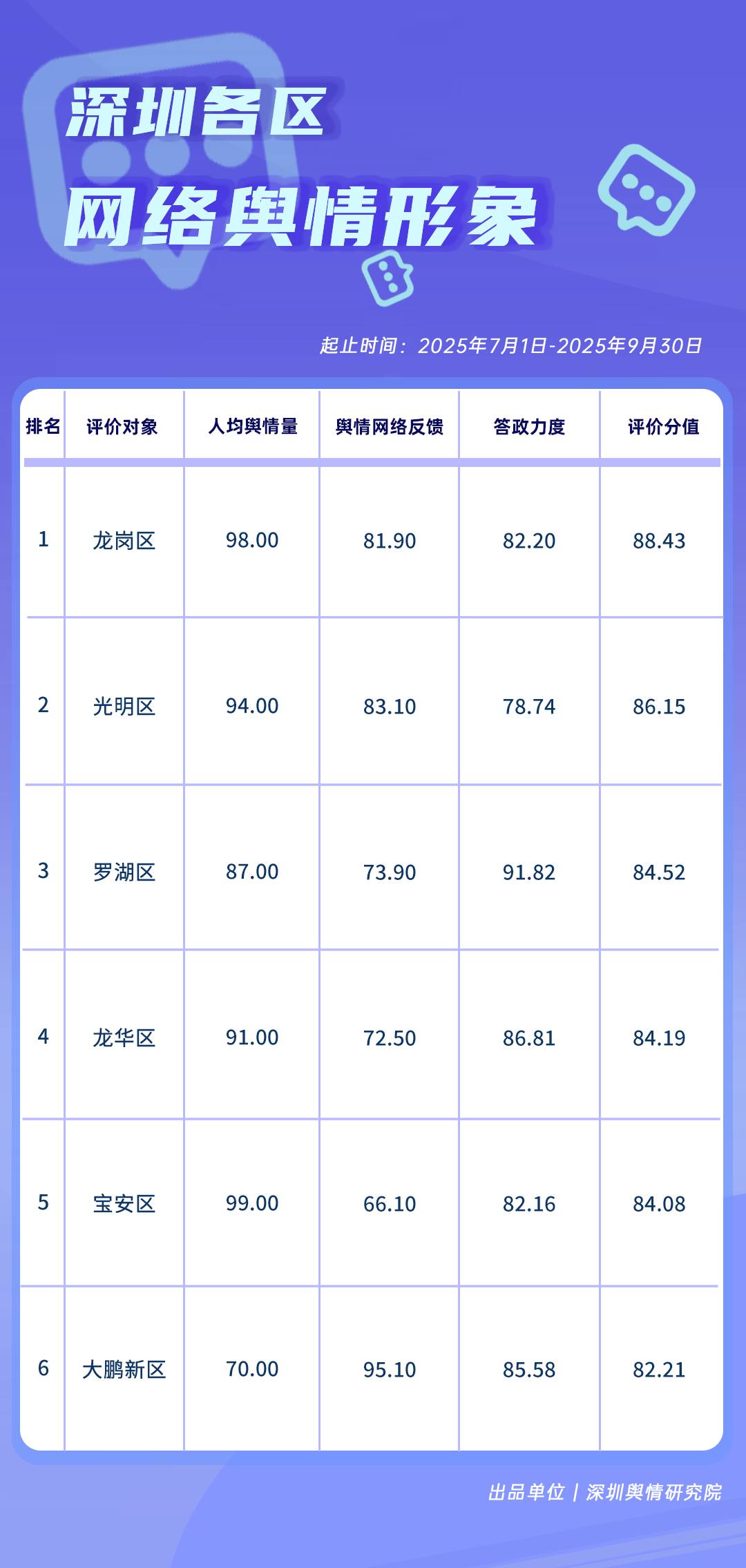 7-9月,在网络舆情方面,龙岗区、光明区得分在86分以上,位居榜单前二,人均舆情量得分较高。罗湖区、龙华区、宝安区、大鹏新区在舆情治理方面也各有亮点,充分体现了各区在维护清朗网络空间、高效回应公众关切方面的积极作为与责任担当。
